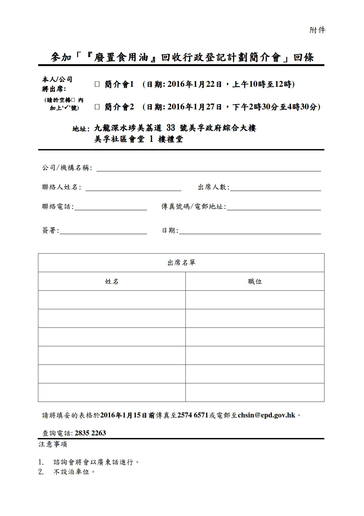 現附上環保署通知環境衞生業界上述登記計劃的諮詢文件、小冊子及簡介會回條,如欲報名出席簡介會,敬請於2016年1月15日前傳真2574 6571或電郵chsin@epd.gov.hk回條。如閣下對上述事宜有任何疑問,請致電環保署2835 2263向冼小姐查詢。