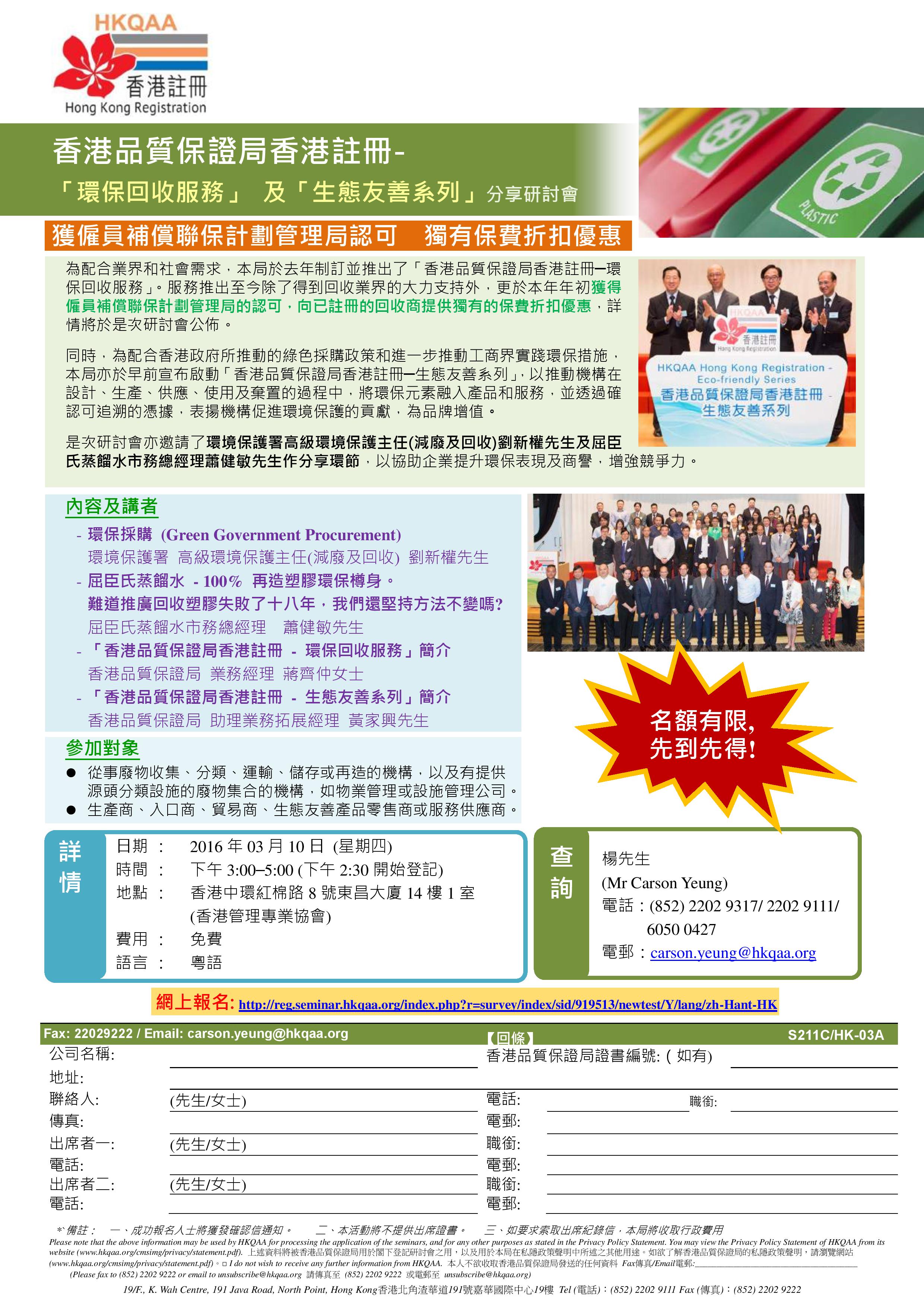 現附上該研討會之宣傅單張,如欲報名出席「環保回收服務」及「生態友善系列」分享研討會,敬請於2016年1月15日前透過電郵carson.yeung@hkqaa.org或於網上報名(http://reg.seminar.hkqaa.org/index.php?r=survey/index/sid/919513/newtest/Y/lang/zh-Hant-HK)。如閣下對上述事宜有任何查詢,請致電香港品質保證局2202 9317或2202 9111與楊先生聯絡。