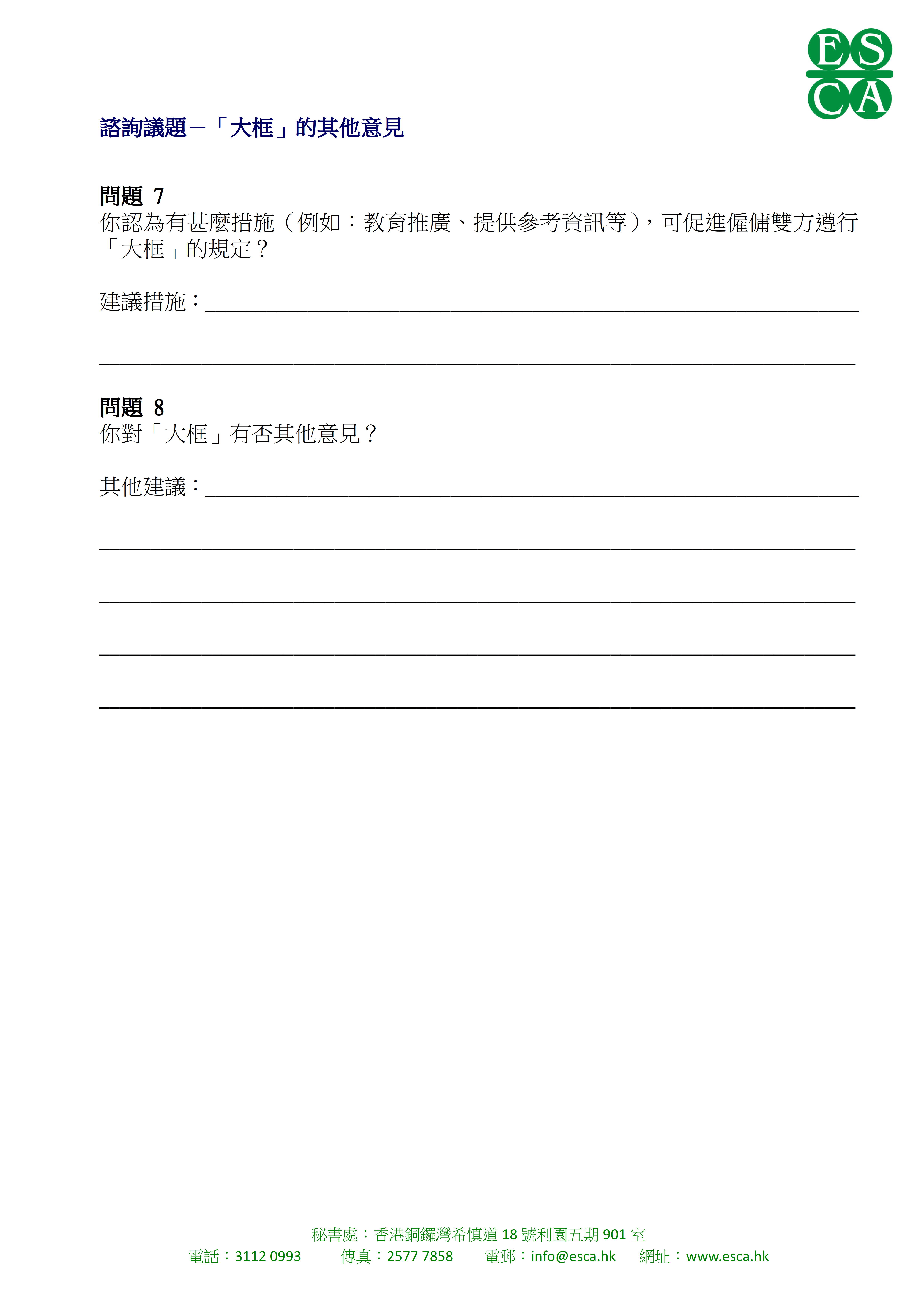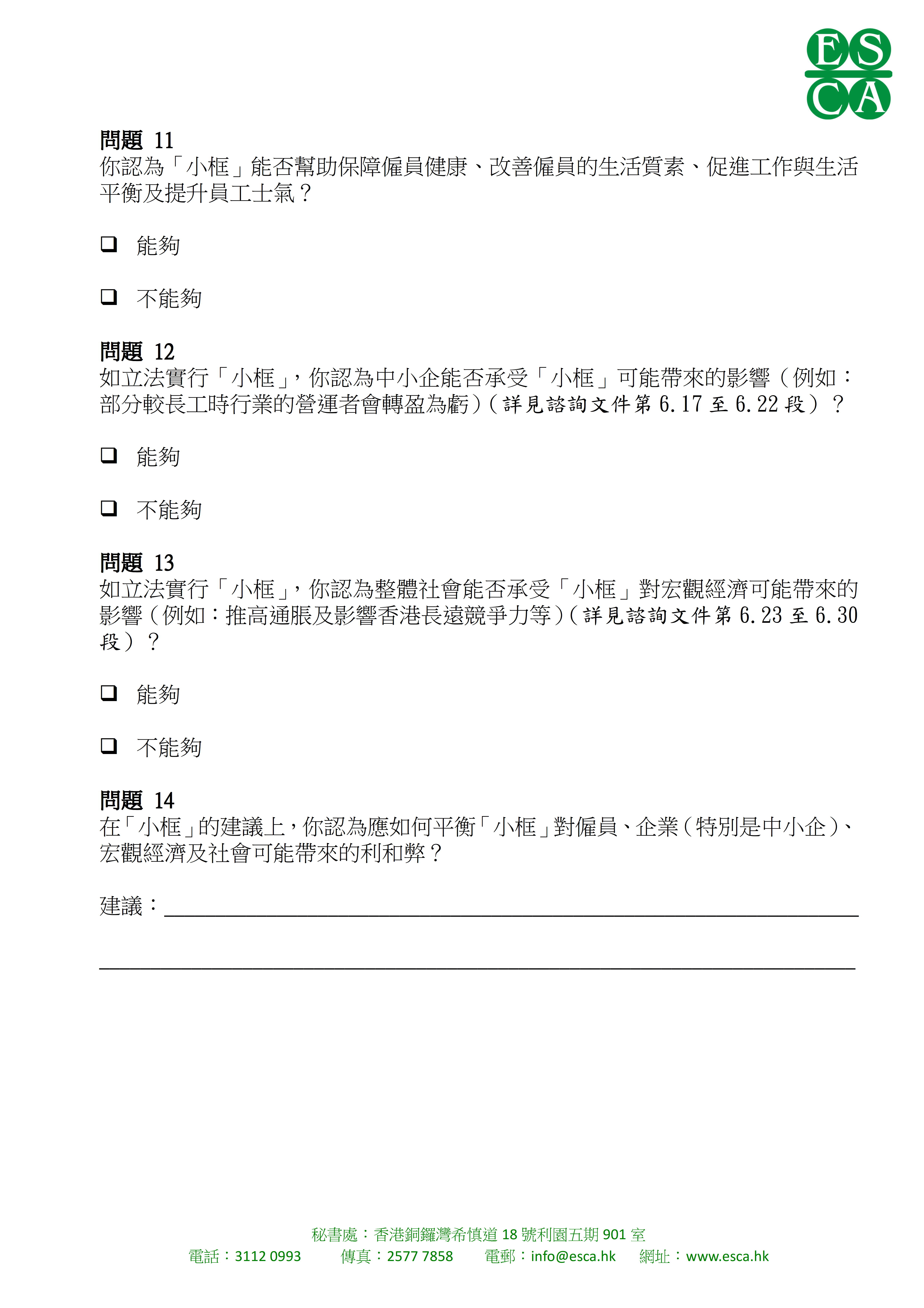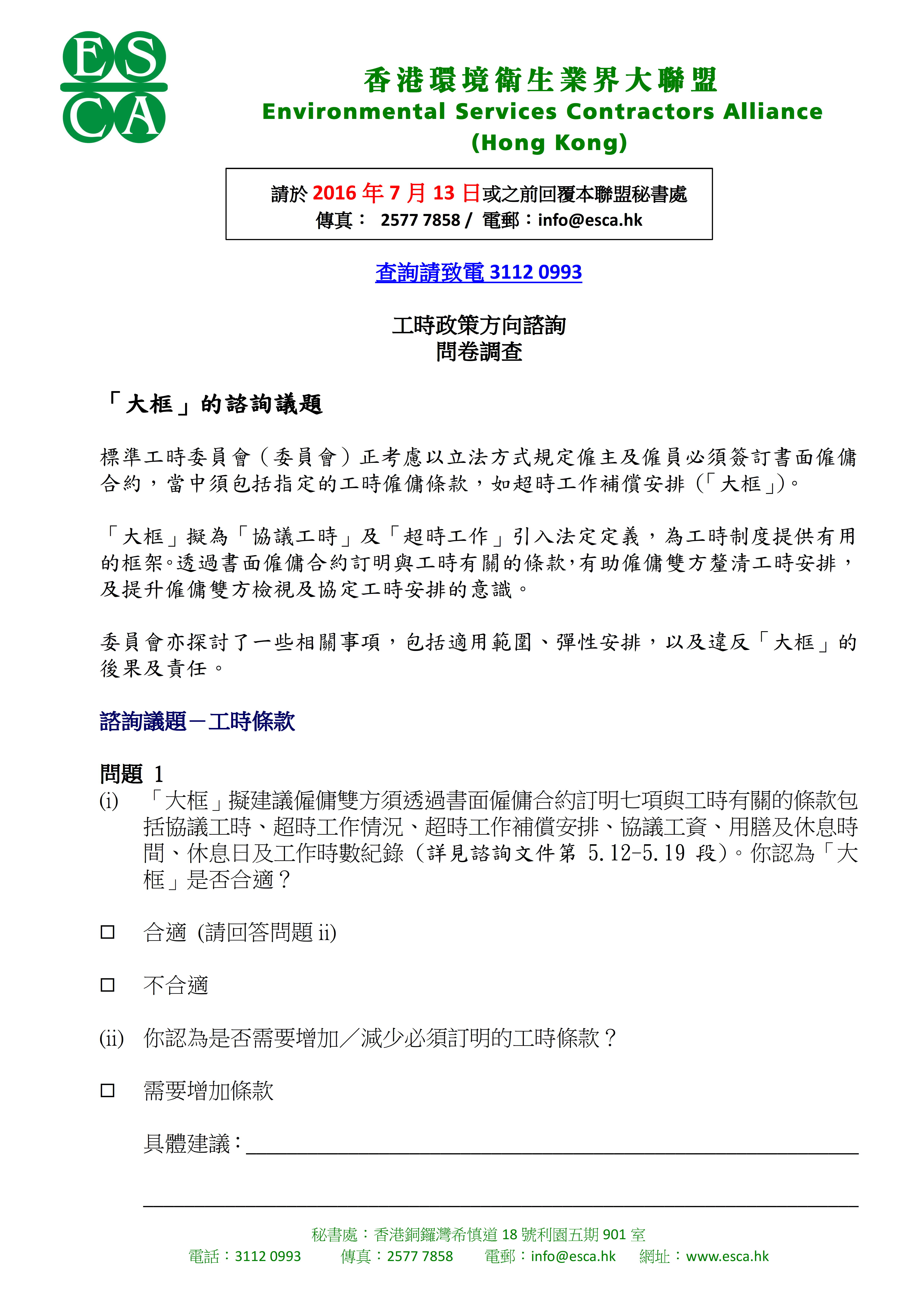大聯盟現正進行「工時政策方向諮詢 」問卷調查 ,誠邀 貴會屬下會員公司抽空回答附件問卷,以便深入了解業界對有關議題的看法。本聯盟會把收集所得的資料匯合整理,將會代表業界把意見書呈交予標準工時委員會。敬細閱「工時政策方向諮詢文件」,並於2016年7月13日前回覆 (傳真:2577 7858 / 電郵:info@esca.hk)。